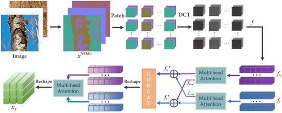 The specific frequency auxiliary module is shown in Figure 5. Firstly, the input image is processed using the YCbCr color space, which can fully utilize its characteristics of separating luminance and chrominance, improve compression efficiency, and more accurately reflect the detailed features of the image while maintaining image quality. Then, the block processing and discrete cosine transform (DCT) are performed to obtain spectral information. The spectral information is integrated and output, which can be divided into high-frequency and low-frequency components. The high-frequency information enhances the detailed features such as edges and textures of the objects in the image, while the low-frequency information forms the overall framework of the image. These two components are separately input into two multi-head self-attention modules, and their outputs are concatenated and reshaped to restore the original shape. Subsequently, multi-head self-attention is used to harmonize all frequency band information, and finally, frequency feature information is obtained through upsampling operations. The formulas for the progress are as follows:
