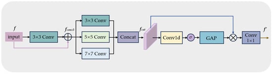 In the formula, GAP is the abbreviation for global average pooling, represents the sigmoid activation function, denotes element-wise multiplication, represents i × i convolution, and denotes the one-dimensional convolution operation and ⊕ denotes element-wise addition.