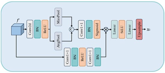 Subsequently, the feature f′ is processed through a 1 × 1 convolution layer, a BN layer, and a ReLU function to obtain . Then, the previously processed feature f‴ is fused with , and the fused result is further processed through a linear operation and a SiLU activation function. Finally, the upsampling process is used to output the features as . This process can alternatively be represented mathematically as follows: