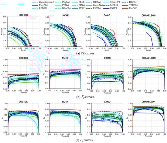 To facilitate comparison with existing methods, this paper adopts the following five evaluation metrics: Mean Absolute Error (MAE) [37], S-Measure () [38], F-Measure (), Weighted F-Measures () [39], and E-measure () [40]. Moreover, as shown in Figure 8, we use precision–recall (PR) curves, curves, and curves to visualize the algorithm performance.