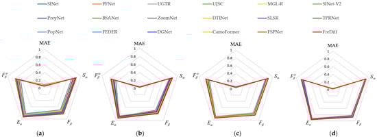Radar plots for the evaluation metrics on the four COS datasets. (a) CAMO; (b) COD10K; (c) NC4K; (d) CHAMELEON.