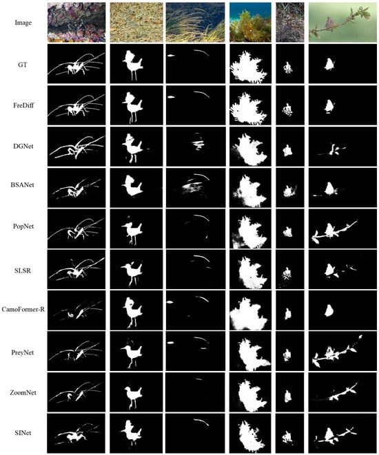 As shown in Figure 10, FreDiff can effectively separate camouflaged targets from the background. FreDiff uses frequency information to assist in feature extraction and then iteratively denoises the camouflaged segmentation map, endowing the model with more complete semantic information. As shown in the fourth column of the figure, other methods are unable to accurately distinguish the camouflaged objects in the image, but our proposed FreDiff can recognize the camouflaged objects completely and clearly, especially the detailed edge information of the targets. Furthermore, we can observe that when there are multiple targets in the third column of images, our method can effectively segment the camouflaged objects among them. GFM provides the rich global information and understanding of contextual relationships, as shown in the last column; FreDiff can segment the camouflaged objects more accurately without being disturbed by non-camouflaged objects.