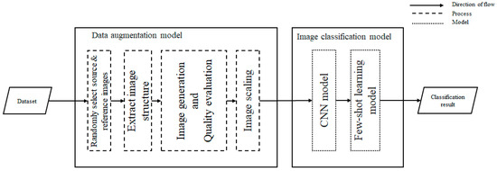 Figure 1 depicts the rare data image classification system proposed in this study, which utilizes FSL. The proposed system comprises data augmentation and image classification models. The data augmentation model is used to preprocess a dataset that is then used by the image classification model. The image classification model learns from the processed dataset and predicts the results of fake and real images using features learned through CNNs and FSL.