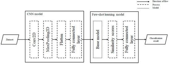Figure 4 shows the architecture of an image classification model. The image model consists of a CNN model and an FSL model, with the CNN model serving as the basis for the FSL model. The CNN structure identifies features within the image by utilizing convolution, max-pooling, and flatten layers.