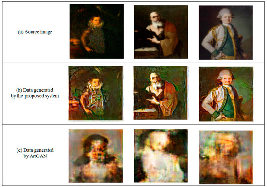 We conducted an experiment to reduce the amount of available data and maximize the features of the rare data. We aimed to confirm the difference between the training results of the model with a large dataset of 1000 samples and the training results of the rare data. For the cases of 500 and 100 samples, we conducted experiments to compare the classification accuracy between the existing image classification model and the proposed system while gradually reducing the amount of rare data. We tested all experimental datasets with training and test data at an 8:2 ratio. In addition to the augmented system, we also tested the ArtGAN-generated [17] images provided by Wikiart. We further experimented with the ArtGAN data to verify whether the augmented model technology of the proposed system could be generalized and to evaluate the generalization performance of fake image discrimination for the generated images. Our experiment aims to determine whether the classification accuracy of the proposed system is superior to that of the existing image classification model, even in cases involving rare data. Based on the source images in Figure 5a, we used the augmented dataset obtained through the proposed system in Figure 5b and the ArtGAN dataset in Figure 5c as experimental data. The hyperparameters were chosen using Bayesian optimization [21]. We experimented with 1000 epochs, a batch size of 32, a learning rate of 0.001, and a dropout of 0.5 for both the CNN and the proposed system.