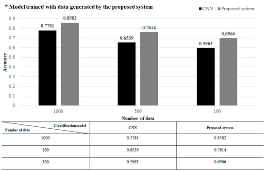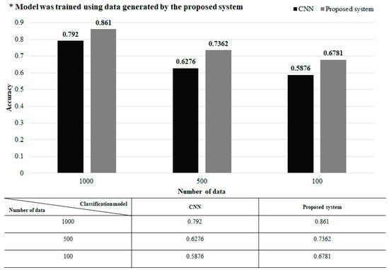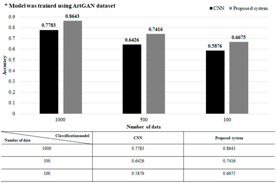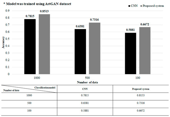As shown in Figure 6 and Figure 7, the proposed system improved the average classification accuracy of the 1000 painting data samples during the experiment by approximately 8%, compared with the existing image classification model (i.e., the CNN). In the case of 100 samples, which had the least amount of data, the proposed system achieved an average classification accuracy of approximately 15% higher than that of the CNN.