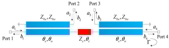 When Port 4 is open [], this means that . Substituting (2) into (4) and (5), respectively, yields the expressions of the reflection and transmission coefficients of the even-mode and odd-mode circuits: