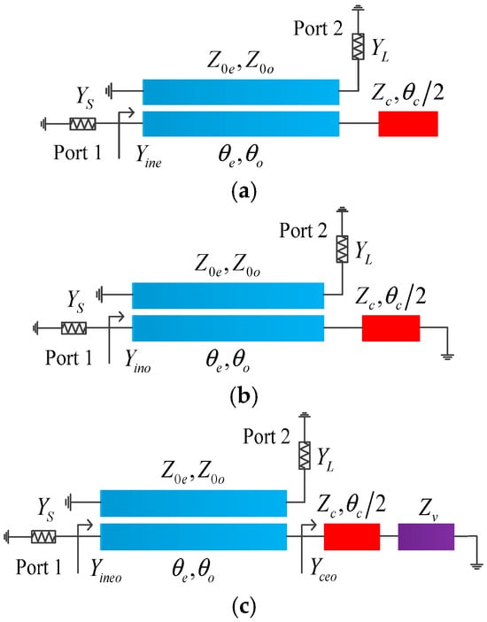 Half circuits of the Marchand balun: (a) even-mode; (b) odd-mode; (c) unified-mode.