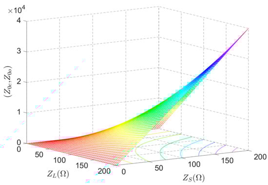 Equation (20) reveals the quantitative relationship between the unbalanced input port impedance (), the balanced output port impedance (), and even–odd-mode impedances of the coupled transmission lines (). In addition, the quantitative relation is plotted and shown in Figure 3, which is a quarter-saddle diagram for designing a Marchand balun.