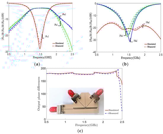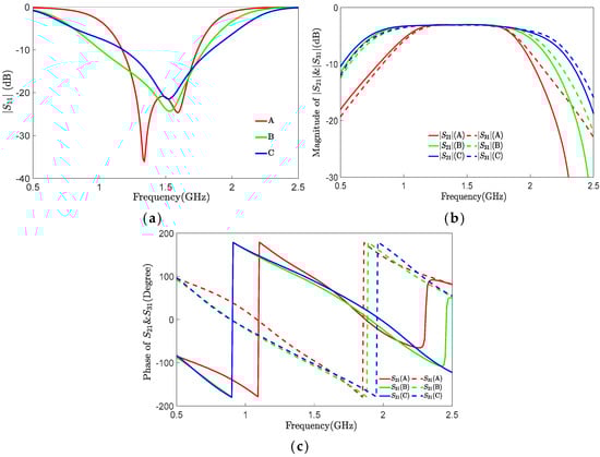 Simulated results of a Marchand balun with Ω: (a) the matching of ; (b) the magnitude of and ; (c) the phase of and .
