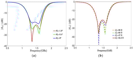 Because of the unavoidable physical separation between balanced ports, it is always necessary to insert additional lines between them. Equation (19) shows that connecting segments have a direct relationship with input port matching. Under the conditions of Ω and Ω, and Ω, Figure 6a reveals the effect of different electrical lengths on input port matching. When = 1.8°, the influence of different characteristic impedances of the connecting section on the input port matching is shown in Figure 6b. It is seen that the change in has a great influence on input port matching.