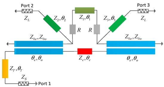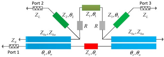 Based on (20) and the isolation circuit structure shown in Figure 7, impedance converter [] is introduced at the output ports. A balun schematic with all-port matching and full-frequency isolation between balanced ports is proposed and shown in Figure 8.