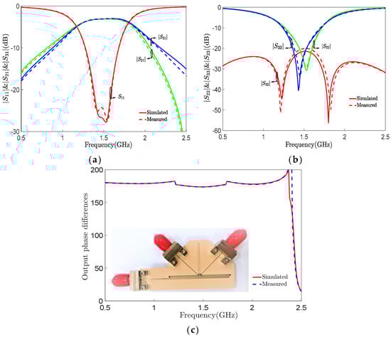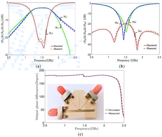 The electrical length of remains about , which can be finetuned to slightly optimize the balun performance. All the parameters of these baluns are listed in Table 4 and their simulated results are shown in Figure 11 and Figure 12. In addition, these two baluns are also fabricated using the microstrip implementation a substrate (dielectric constant: 9.8, thickness: 0.635 mm). The photographs of the fabricated baluns are also displayed in Figure 11c and Figure 12c. The fabricated baluns are measured with an Agilent N5244A vector network analyzer, and then their measured results are presented in Figure 11 and Figure 12.