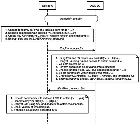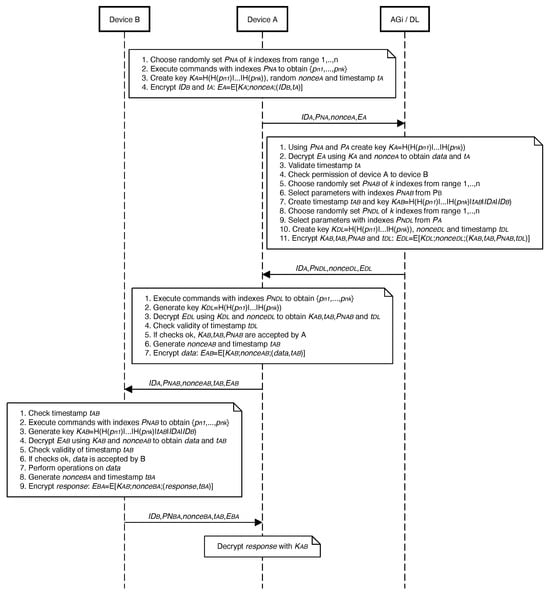 The communication procedure between the IoT device and the DL node is shown in Figure 2. When device A needs to communicate with DL, e.g., to write to a channel, it must generate k random numbers from the set {}, which are used as indexes to the parameters stored in . The values of the indexed parameters are concatenated together, and the hash of the concatenation produces a key . This key and a freshly generated are used to encrypt along with the current timestamp . The encrypted message is sent, together with , to , which reconstructs the key , decrypts , and verifies the timestamp . If the difference between and the current time is less than the preconfigured threshold, an appropriate operation is performed on . Some possible operations include writing data to a ledger or other database, reading data from a ledger or other database, and verifying permissions. The is sent to the device A secured in the same way as the message from the device. After receiving the , device A reconstructs the key , decrypts the ciphertext , and verifies the timestamp . If it is correct, the is accepted by device A.