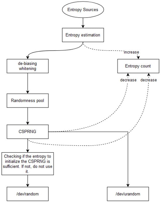 - Pousse, B. Short Communication: An Interpretation of the Linux Entropy Estimator. Cryptology ePrint Archive, Paper 2012/487. 2012. Available online: https://eprint.iacr.org/2012/487 (accessed on 29 September 2024).