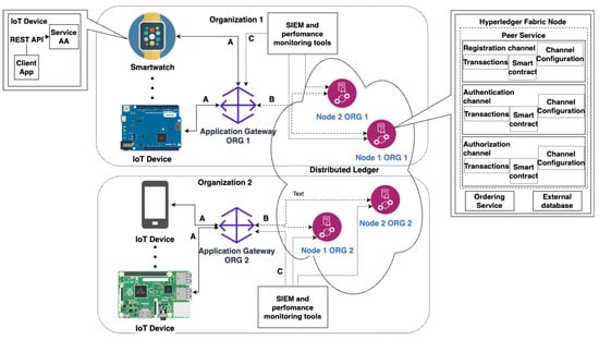 Authorization is based on the Access Control Lists (ACLs) stored in the DL authorization channel, in which each device has an entry that contains a list of other devices with which it can interact, including allowed actions. Other authorization methods, for example, Role-based Access Control (RBAC), can also be implemented. The type of authorization mechanism must be agreed upon between the members of the federation before establishing the DL network. The authorization channel is separate from the one used to store the information required for authentication. Permissions for a given IoT device can only be granted or removed by the security administrator of the organization to which the device belongs based on the identified needs of business processes and workflows supported by the devices. Each operation in the authorization channel is performed using the appropriate smart contract. If device A wants to check if it can interact with device B, it sends and an operation type to DL. Using smart contracts for authorization enables federation partners to formulate fine-grained security policies regarding the utilization of their assets and thus maintain control over information flows and access granted to other federation partners. Moreover, the DL provides a secure audit log for interaction between the devices, enabling security forensics and supporting monitoring and detection for possible faults or security anomalies. Any DL node can perform the check and send a response, which increases the resilience of the federated system to the disconnection of some of the nodes due to adversary activities or infrastructure failures. The communication is secured in the same way as described in Section 3.2.
