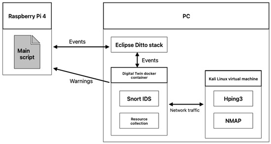 The PC is responsible for hosting the DT and IDS, where Eclipse Ditto is deployed in a Docker container to manage the Digital Twins. The Raspberry Pi acts as a physical IoT device, replicating real-world devices in smart city infrastructures. Finally, the Kali Linux VM performs penetration testing, enabling the simulation of various cyberattacks to evaluate the resilience of the DT-IDS integration.
