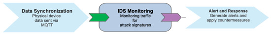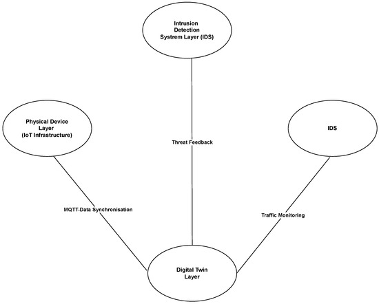These components are interconnected through communication protocols like MQTT, ensuring seamless synchronization between the physical device and its twin. The data collected by the IDS are analyzed in conjunction with the Digital Twin’s simulation to provide a comprehensive view of potential vulnerabilities. To further improve readability and understanding, we added additional explanations of how the layers communicate and interact within the system architecture. This includes describing the specific roles each component plays in ensuring that the system remains secure and scalable. Figure 2 illustrates the system architecture of the proposed solution.