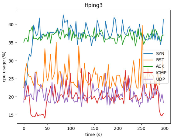 This sustained high CPU utilization during SYN and ACK flood attacks suggests that the Digital Twin effectively tracks numerous half-open connections, emphasizing the importance of CPU resources in maintaining operational integrity under attack. For instance, as shown in Figure 5, the SYN and ACK floods exhibited sustained high CPU usage, consistently hovering around 35–40% throughout the attack duration. The SYN attack in particular showed the highest sustained CPU load, indicating the continuous strain caused by handling numerous half-open connections. The ICMP attack, while more variable, also caused high CPU usage with several spikes surpassing 35%. This behavior reflects the strain caused by high packet throughput and intense network activity during the ICMP flood. In contrast, RST and UDP attacks caused lower and more variable CPU usage, typically remaining below 30%. These findings suggest that the SYN, ACK, and ICMP attacks place the most sustained load on CPU resources, potentially impacting system performance under prolonged attack conditions.