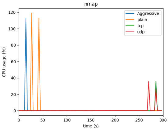 The NMAP attacks, on the other hand, resulted in shorter bursts of CPU utilization. Despite lasting for only a minute, these scans caused brief but significant peaks in CPU consumption. This suggests that although NMAP scans are stealthier, they can still impose considerable load on the system for short periods.