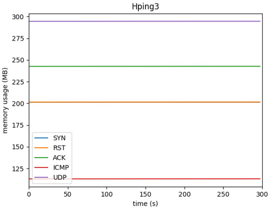 Hping3 SYN and ACK floods did not maintain a baseline memory usage of 113 MB. As seen in Figure 7, the ACK flood exhibited a stable memory usage close to 250 MB, and the SYN flood was also considerably higher than the expected 113 MB baseline, hovering around 225 MB. The RST and ICMP attacks consumed 200 MB and 300 MB of memory, respectively, indicating significant variation across attack types. This suggests that while CPU usage is highly dynamic during these attacks, memory usage tends to stabilize at higher levels, especially during ACK and ICMP floods, which place greater strain on memory resources than previously anticipated.