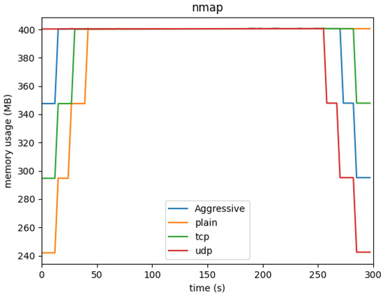 Memory consumption remained relatively stable for most of the Hping3 attacks, as shown in Figure 7 and Figure 8. For instance, the Hping3 SYN and ACK floods caused minimal changes in memory usage, maintaining close to the baseline memory usage of 113 MB. The memory usage for the NMAP aggressive scan initially increased significantly, but as shown in Figure 8, it decreased towards the end of the scan, contrary to the earlier assumption that it remained high.