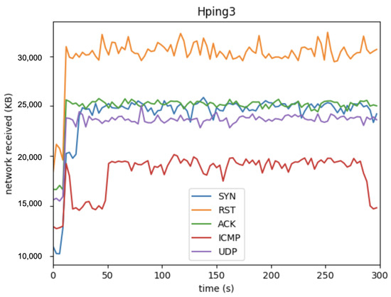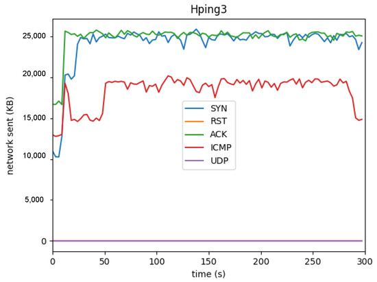 In the case of Hping3 SYN, ACK, and ICMP attacks, the network traffic was consistently high as these attacks actively sent packets and received responses. The ICMP attack showed the highest network traffic due to its high packet volume. On the other hand, the Hping3 RST and UDP attacks generated less network traffic, as no responses were received, leading to a drop in outgoing traffic after the initial flood.