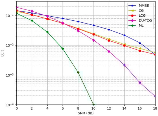 Figure 4 shows that although the ML detector offers the lowest bit error rates, the proposed DU-TCG can perform better than other gradient-based techniques such as CG, and LCG and traditional MMSE, which makes it a promising candidate for practical applications. The proposed DU-TCG method has approximately 4 dB SNR gain over CG and LCG methods at BER values of 10−3. In Figure 4, all methods except ML have poor BER performance at low SNR values as expected. Unlike ML, iterative methods are more affected by low SNR values during the initial iterations, leading to suboptimal results.
