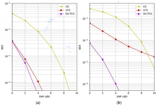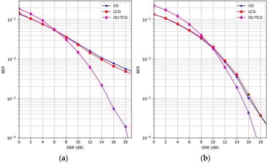 Figure 7 presents the BER performance of CG, LCG, and the proposed DU-TCG methods for BPSK and QAM16 modulation types for a 32 × 128 MIMO layout in TDL-A channel.