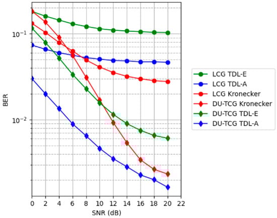 Besides the conventional MIMO scheme and channel models discussed above, in Figure 6, we also compare the performance of DU-TCG with Kronecker, TDL-A, and TDL-E channel models for the 32 × 64 MIMO scheme with BPSK modulation. Since the channel conditions are challenging, 15 layers are used here in the training process.