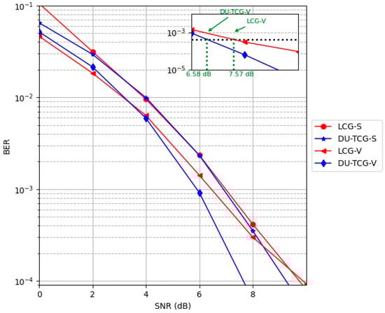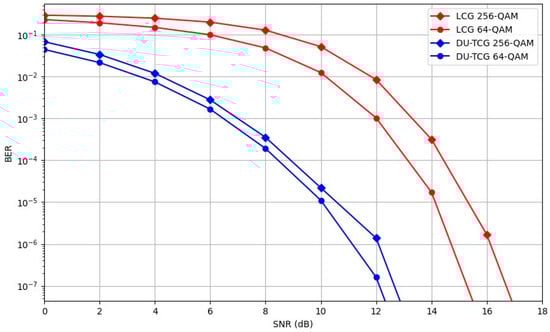 Additionally, in the simulation results presented above, the BER values are limited to 10−4, as in similar studies utilizing deep unfolding methods in the literature [,]. Achieving lower BER values in the simulation environment, particularly for deep-unfolding-based methods, usually requires considerably longer simulation times and higher computational resources, which is impractical for our current computing environment. Nevertheless, we conducted an extensive simulation to achieve lower BER values, and the results are presented in Figure 8, which illustrates the BER performance of the LCG and DU-TCG techniques for 64-QAM and 256-QAM modulations in a 32 × 64 MIMO system under Rayleigh fading conditions.