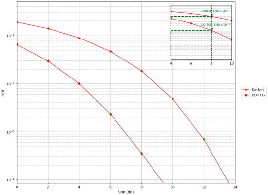 BER performance between DU-TCG and DetNet in a 32 × 64 MIMO system.