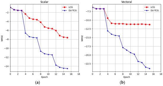 The NMSE performance of the proposed DU-TCG and LCG methods, shown in logarithmic scale, for scalar and vector parameterization, is illustrated in Figure 10 for a 32 × 64 MIMO layout.