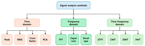 The provided Figure 2 shows that the signal analysis of motor drives is mainly divided into the time domain, frequency domain, and time–frequency domain analyses. In time domain analysis, indicators such as peak, RMS, and crest factor are used to identify mechanical faults. Frequency domain analysis employs FFT and cepstrum analysis to precisely detect anomalies at specific frequencies [43]. Time–frequency analysis captures the dynamic changes in the system and identifies complex fault patterns using STFT, CWT, and HHT [44,45]. These multifaceted analysis methods are essential for fault diagnosis in motor drives, and an integrated approach maximizes diagnostic precision [46,47].