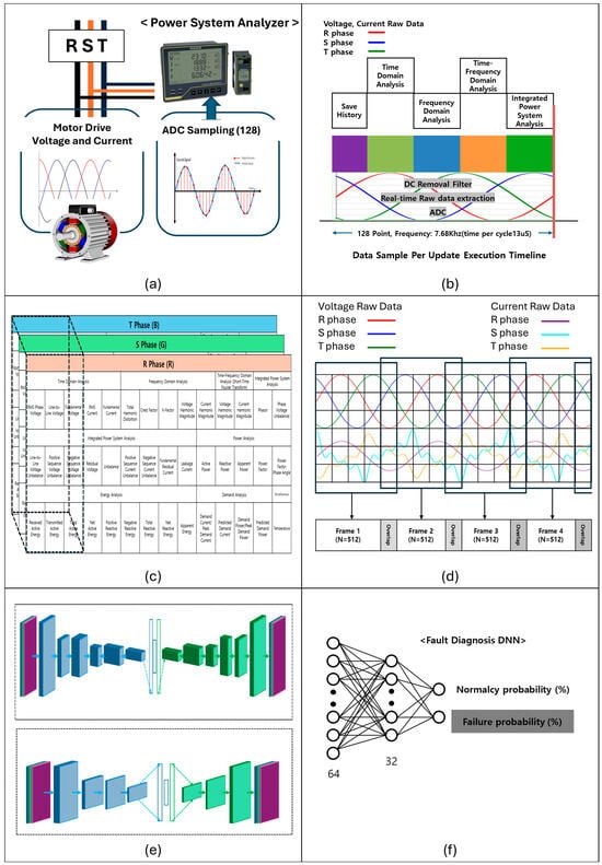 Visualization of the electric motor fault diagnosis process using CNN autoencoder and DNN: (a) data collection; (b) real-time data processing and analysis flow through power system analyzer; (c) CNN data structure of power system analysis data; (d) sliding window technique for time-series segmentation of electrical signals; (e) CAE structure for raw data and power system analysis data; (f) DNN structure combining CAE features.
