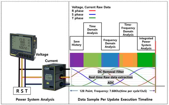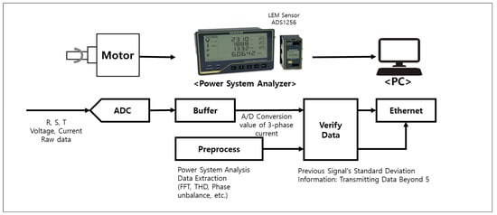 Figure 5 illustrates the process of digitizing the raw voltage and current data from the R, S, and T phases generated by the motor using a high-precision analog-to-digital converter (ADC). These data are then passed to the power system analysis process for the analysis of FFT, THD, and phase unbalance. After the analyzed data are validated for accuracy using standard deviation information, it is transmitted to a PC via Ethernet for real-time monitoring and analysis.