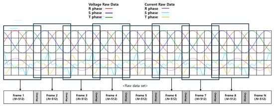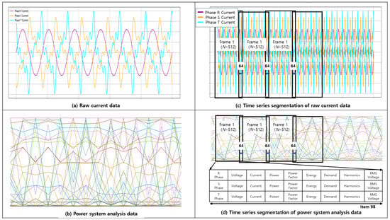 Figure 1 summarizes the data processing and analysis procedure for motor fault diagnosis. In Figure (a) data collection, voltage and current data from the motor are collected. In Figure (b) real-time data processing and analysis, the data are processed in real time using a power system analyzer, and if any abnormal signs are detected, the data are transmitted. Figure (c) time-series data segmentation through the sliding window technique involves segmenting the data into frames to extract significant features. Finally, in Figure (d) fault prediction through the combined CAE + DNN model, the extracted features are utilized to accurately predict motor faults. This integrated approach enhances the accuracy of motor fault diagnosis and improves upon the existing methods by enabling real-time applicability.