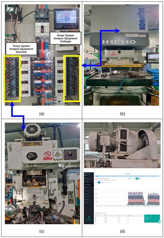 Analysis and operation equipment using CNN autoencoder and DNN combination for power system analysis: (a) voltage and current analysis system (power system analysis); (b) 110-ton mechanical press; (c) 80-ton mechanical press; (d) motor and real-time data monitoring software.