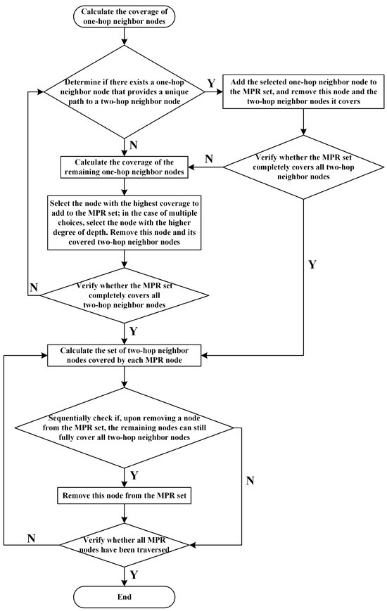 This paper proposes an improved MPR selection algorithm from the necessity perspective, eliminating the redundancy present in traditional algorithms. The algorithm flow is shown in Figure 2. The relevant concepts involved in the algorithm process are as follows: