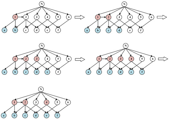 The MPR selection mechanism is central to the OLSR protocol. Its purpose is to ensure that nodes in the network periodically send topology control information to all two-hop neighbors to quickly acquire the overall network topology while minimizing the retransmission of topology control packets, thereby reducing network control overhead [18,19,20]. However, the traditional MPR selection algorithm’s preference for nodes with high coverage can lead to redundant MPR nodes, which increases the flooding of TC messages and consequently causes exponential growth in the network overhead. Given the limited channel resources, this heightens the risk of network congestion, potentially leading to the accumulation and expiration of control packets, route failures, or even network paralysis. Hence, MPR sets should be chosen based on the necessity of connection. If other MPR sets’ two-hop neighbors also cover a node covered by an MPR set’s two-hop neighbor, it indicates that this node is redundant in the MPR set and should be removed.