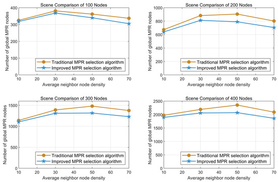 In this study, networks were formed by randomly setting 100, 200, 300, and 400 nodes, while controlling the coverage radius of the nodes to achieve an average number of neighboring nodes of 10, 20, 40, and 60. We compared the number of global MPR nodes obtained using the improved MPR selection algorithm with that of the standard MPR selection algorithm under the same network scale. The results indicated that, under varying densities, the improved MPR selection algorithm demonstrates a reduction in the number of calculated MPR nodes ranging from 2% to 12% compared to the standard algorithm. This finding suggests that the improved MPR selection algorithm can significantly reduce the redundancy of MPR nodes, as shown in Figure 4.