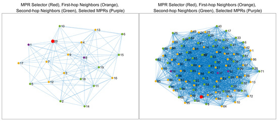 The improved MPR selection algorithm significantly reduces redundant nodes within the MPR set from a necessity standpoint. As illustrated in Figure 5, in a small-scale sparse network, where the number of neighbor nodes per node is relatively few, the traditional MPR selection algorithm results in fewer redundant MPR nodes. Hence, the improvement effect is not pronounced. However, in a large-scale dense network, where the number of neighbor nodes per node is relatively high, the traditional MPR selection algorithm leads to many redundant MPR nodes. The improved algorithm can significantly reduce redundancy. This demonstrates that the advantages of the improved MPR selection algorithm are more evident in large-scale, dense networks, effectively reducing the control message overhead, cutting down on network topology maintenance costs, and improving routing computation efficiency.