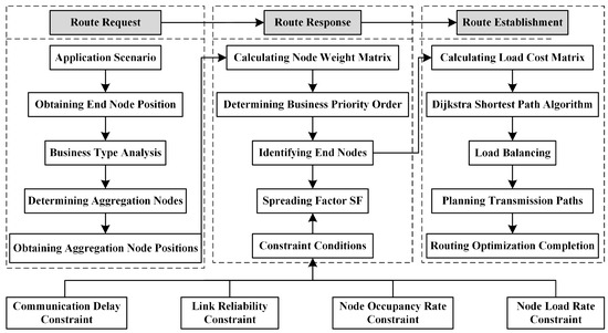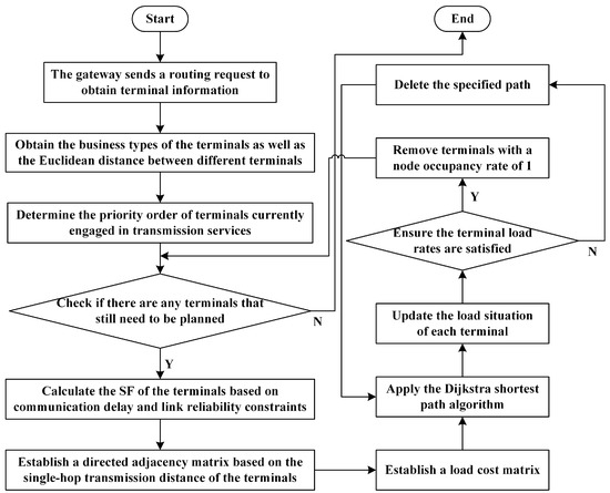 The specific optimization strategy is as follows: Initially, the gateway broadcasts a routing request to obtain information such as the location of the end nodes, link information, end node occupancy rate, and end node load status within the network. Next, it obtains the service type of the end nodes and, at the same time, calculates the node weight matrix based on the end node location information to determine the service priority. Then, it determines the SF that meets the service type for end nodes of different service priorities under constraint conditions, and plasn the transmission path for each end node [23,24]. Afterward, from a global optimum perspective, the node load balance degree and the average node load rate are minimized, and the link with the lowest load cost is selected as the path to reach the aggregation node. Finally, the routing optimization ends.