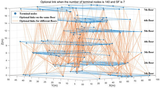 After establishing the adjacency matrix , all possible bidirectional links for terminal nodes under different can be determined. Using a distributed network model within a large building as an example, the simulation model consists of 140 terminal nodes and one gateway distributed within a space of 100 m × 50 m × 18 m, simulating the characteristics of a multi-layer large building. When SF = 7 is selected, the adjacency matrix under constraint conditions provides a feasible link diagram, as shown in Figure 7.