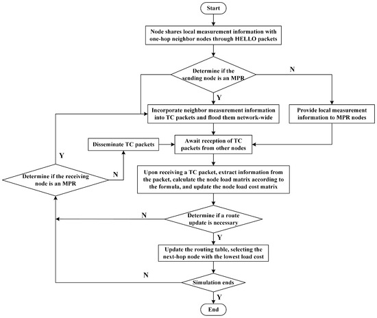 At the initial stage, each node initializes its load cost matrix to an all-zero matrix. Nodes extract topology control information from TC packets sent by neighbor nodes, including the destination addresses, the previous-hop address in the packet, communication distances, data transmission rates, and the load of terminal nodes. The node load matrix is calculated according to Equation (36), and the load cost matrix of the node is updated according to Equation (37). Through this process, the load cost to reach nodes in the set from the current node, with the previous hop being a neighbor, is updated. Upon completion, if the current node is an MPR node, the previous hop address is set to the node itself, and this TC packet is broadcasted network-wide. After a period, the load cost matrices for reaching other nodes in the network are updated. This approach ensures that the network dynamically adjusts the routing based on load conditions, thereby optimizing load distribution and improving network performance.The routing establishment process is shown in Figure 8.