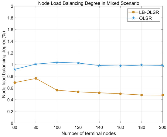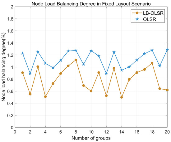 In the fixed-node-number scenarios, the load balancing of terminal nodes across different groups is shown in Figure 11. Random changes in node positions are made within each simulation group based on the fixed-layout scenario, with 20 simulations conducted to obtain the average result. This approach mitigates the impact of randomly generated business nodes and randomly distributed terminal nodes on the experimental results, thus improving result reliability. In these simulations, the load balancing of nodes utilizing the LB-OLSR algorithm remains stable between 0.2 and 0.4, indicating superior performance compared to the OLSR algorithm, which fluctuates between 0.7 and 0.9. The impact of terminal node position distribution leads to variations in load balancing, but overall, the load balancing tends towards stability.