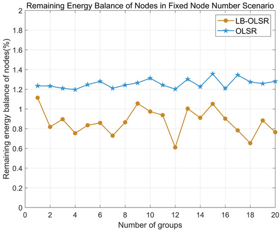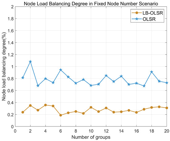 In the fixed-layout scenario simulations, the load balance of terminal nodes within different groups is illustrated in Figure 10. The optimization degree of node load balance varies across different simulation groups due to terminal nodes’ differing numbers and positions carrying monitoring tasks. When the number of business nodes is large, more terminal nodes in the network act as relay nodes to transmit business data, thereby improving the load balance optimization degree of the LB-OLSR algorithm. In fixed-node-number scenario simulations, it is observed that the load balance achieved using the LB-OLSR algorithm is superior to that of the OLSR algorithm across different groups. This indicates that the load-balancing routing optimization method proposed in this study significantly improves load balance.