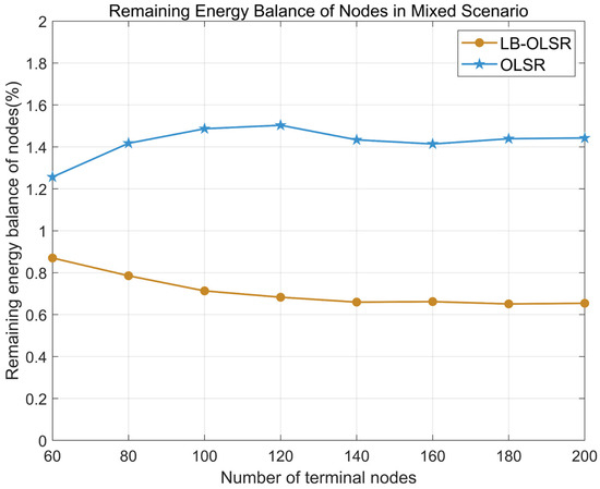 In the mixed-scenario simulation experiment, the remaining energy balance of the nodes in the LB-OLSR algorithm gradually stabilizes at 0.65. This stability is attributed to the dense spatial distribution of terminal nodes within large buildings when the number of terminal nodes increases beyond a certain threshold, resulting in an ample selection of relay nodes and thereby reducing the impact on routing planning. Conversely, in the OLSR algorithm, as the number of terminal nodes increases from 60 to 120, the failure to consider node load and occupancy rates during the planning of transmission paths for service nodes leads to excessive loads on certain nodes, resulting in a noticeable increase in the remaining energy balance among the nodes.The experimental results are shown in Figure 14.