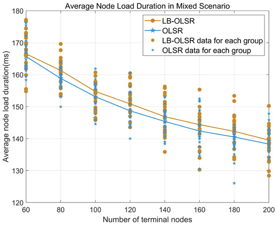 The average node load duration under different terminal node counts is depicted in Figure 15. Compared to the OLSR algorithm, the average node load duration is longer under the LB-OLSR algorithm. This is because the algorithm focuses on optimizing the nodes’ average load rate and load balancing. As a result, the chosen transmission paths to the gateway may not always have the most minor hops or the shortest distance, which can increase the number of times business data are forwarded. On the other hand, the OLSR algorithm uses the minimum hop count as the routing criterion, resulting in a shorter average node load duration. As the number of terminal nodes increases, more relay node choices become available for business data forwarding, potentially reducing hop count and shortening transmission paths, thereby decreasing the average node load duration.