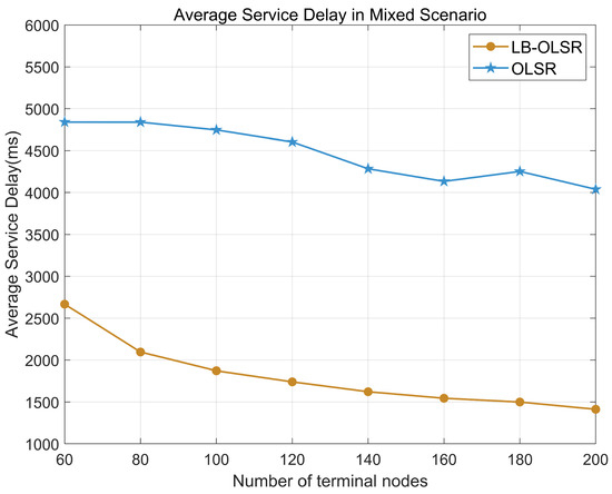The average business delay under different terminal node counts is shown in Figure 16. The LB-OLSR algorithm results in a shorter average business delay than the OLSR algorithm. The proposed load-balancing algorithm comprehensively considers communication delay, link reliability, node occupancy rate, and node load rate. It dynamically adjusts traffic distribution strategies based on node load conditions and routing performance within the network, thereby avoiding congestion and node load imbalance and reducing queuing delays for business data. As the number of terminal nodes increases, the load-balancing algorithm can more effectively utilize these nodes to share the load, accelerating business data processing and reducing business transmission delays.